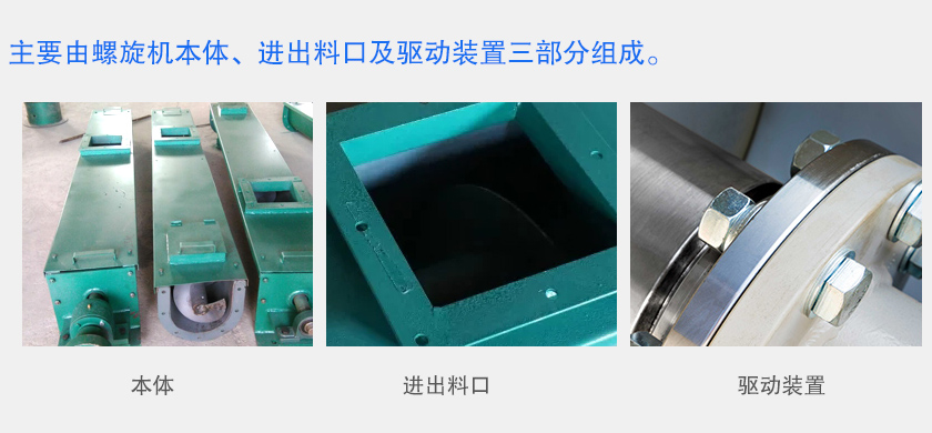 粉末螺旋输送机主要由螺旋机本体、进出料口及驱动装置三部分组成。