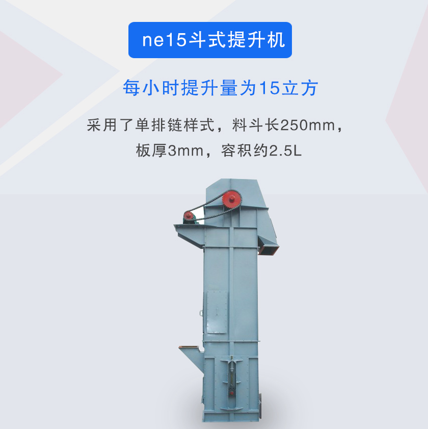 ne15斗式提升机料斗长250mm,板厚3mm,容积约2.5L,每小时提升量为15立方,ne15斗式提升机采用板式链条,耐磨性强,适合垂直提升粉状及块状物料.