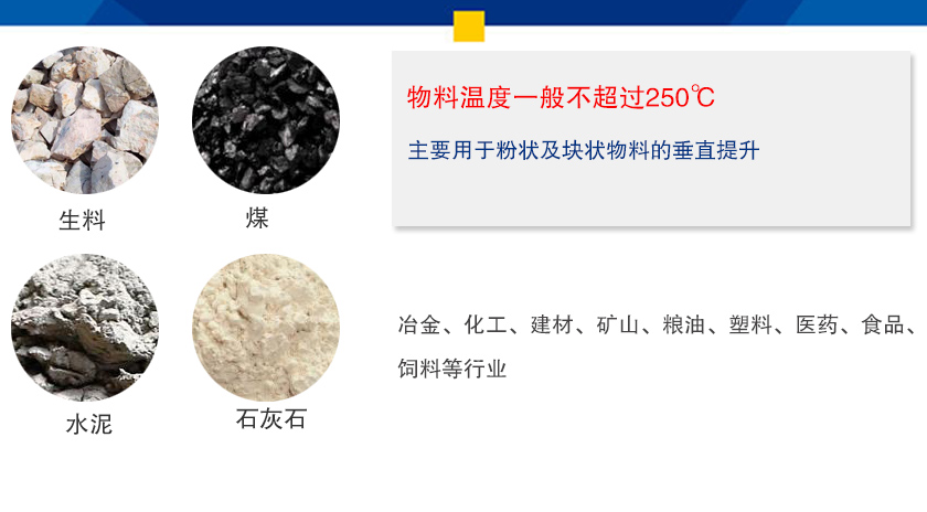 ne15斗式提升机主要用于粉状及块状物料的垂直提升,如生料、水泥、煤、石灰石、干粘土、熟料等,物料温度一般不超过250℃,冶金、化工、建材、矿山、粮油、塑料、医药、食品、饲料等行业。