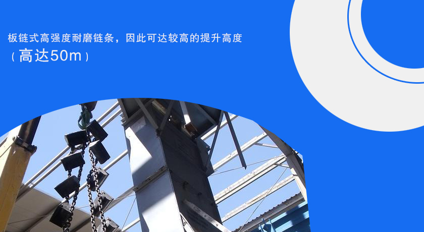 3、板链式高强度耐磨链条,因此可达较高的提升高度(高达50m)。