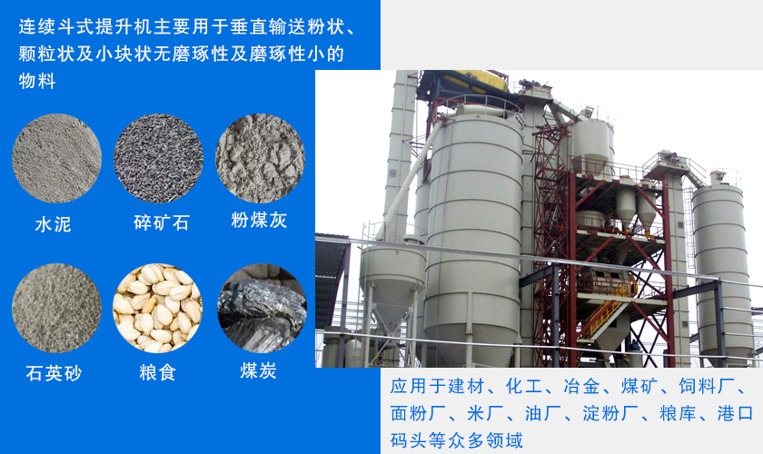 连续斗式提升机主要用于垂直输送粉状、颗粒状及小块状无磨琢性及磨琢性小的物料,如:水泥、粮食、煤炭、粉煤灰、碎矿石、石英砂、石块、粘土、化肥等,应用于建材、化工、冶金、煤矿、饲料厂、面粉厂、米厂、油厂、淀粉厂、粮库、港口码头等众多领域。