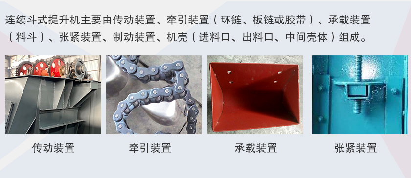 连续斗式提升机主要由传动装置、牵引装置(环链、板链或胶带)、承载装置(料斗)、张紧装置、制动装置、机壳(进料口、出料口、中间壳体)组成。