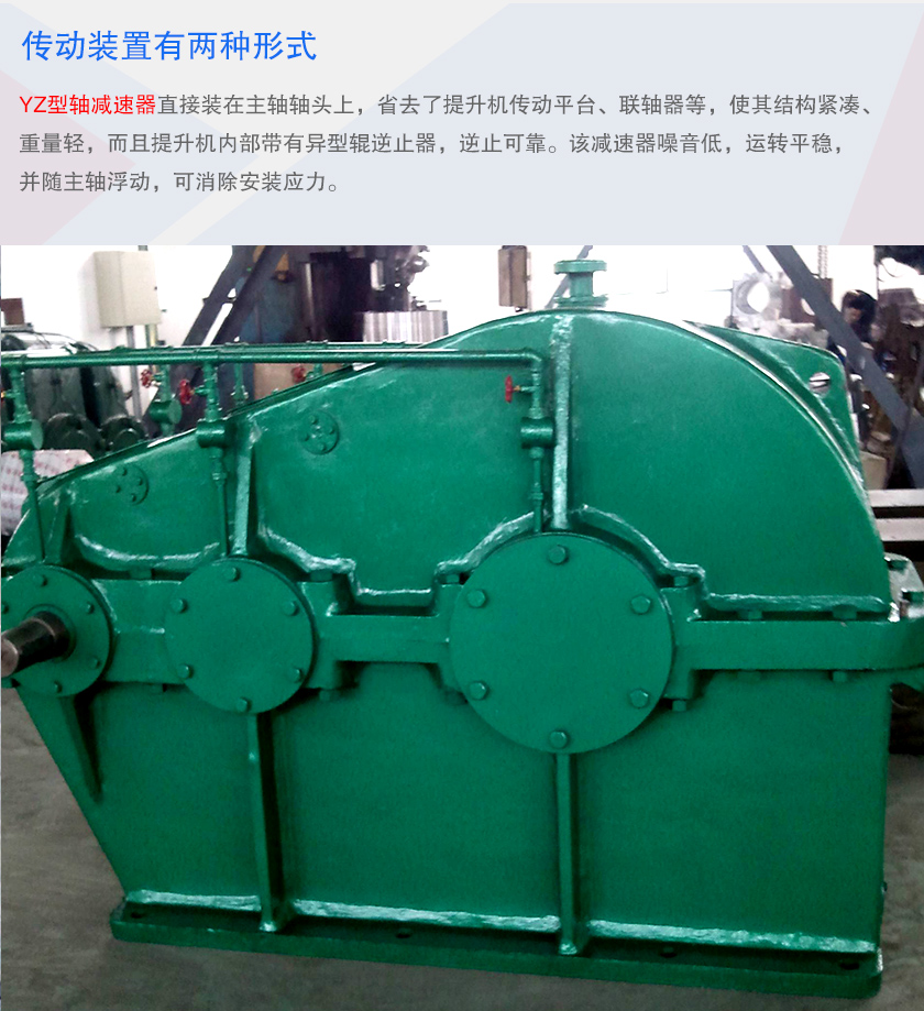 传动装置有两种形式,分别配有YZ型减速器、ZQ(或YY)型减速器。YZ型轴减速器直接装在主轴轴头上,省去了提升机传动平台、联轴器等,使其结构紧凑、重量轻,而且提升机内部带有异型辊逆止器,逆止可靠。该减速器噪音低,运转平稳,并随主轴浮动,可消除安装应力。ZQ型减速器工作环境温度为-40℃到+40℃,转速不大于1500转/分,齿轮传动圆周速度不大于10米/秒,此种类型的减速器强度高,齿面磨损小,使用寿命长。