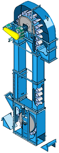 td斗式提升机牵引件为橡胶带,料斗以一定的间隔固定在橡胶带上,橡胶带分别绕过提升机头部和底部的滚筒,构成具有上升有载分支和下降无载分支的闭合环形系统;工作时,布置在提升机头部的驱动装置通过头部滚筒将动力传给橡胶带和料斗,物料从提升机底部的进料口进入料斗,料斗将物料提升至头部的卸料口,在离心力和重力的共同作用下,料斗中的物料经卸料口卸出。