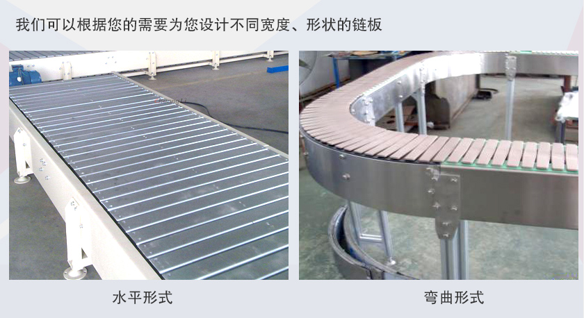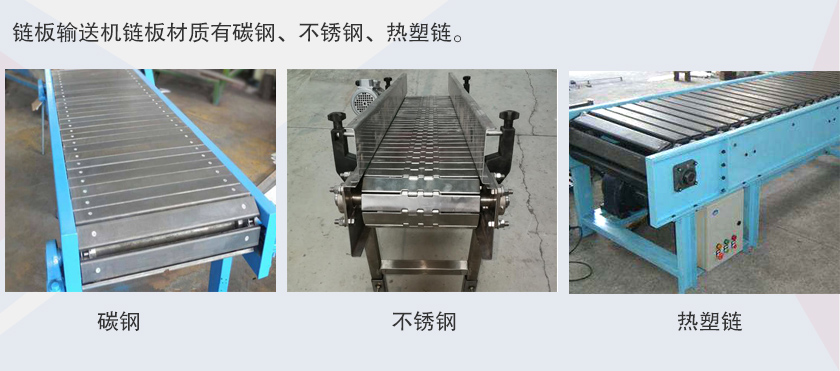 链板式输送机是利用固接在牵引链上的一系列链条提供牵引力,用金属板做为承载体使物料在水平或倾斜方向上输送。