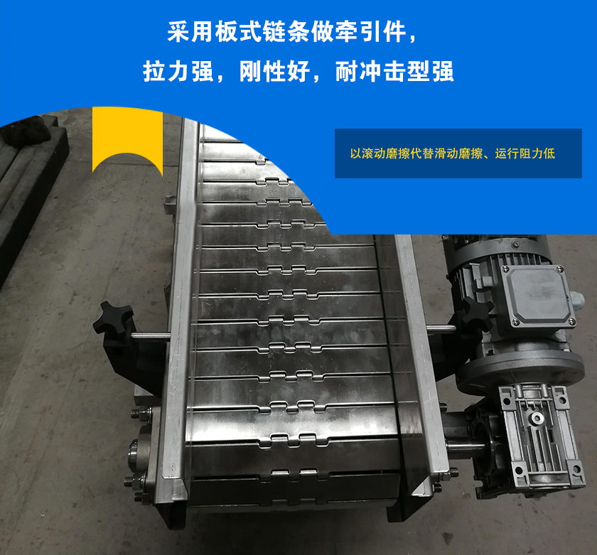 2、采用板式链条做牵引件,拉力强,刚性好,耐冲击型强。