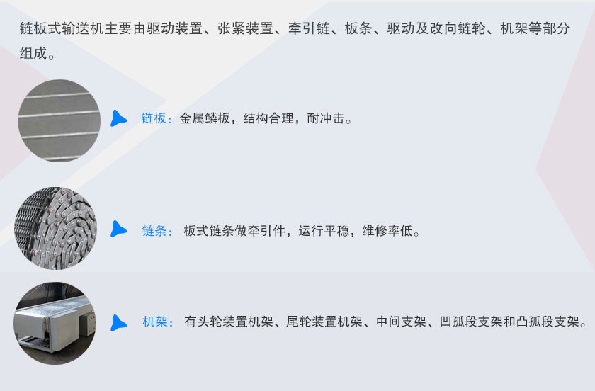 链板式输送机主要由驱动装置、张紧装置、牵引链、板条、驱动及改向链轮、机架等部分组成。