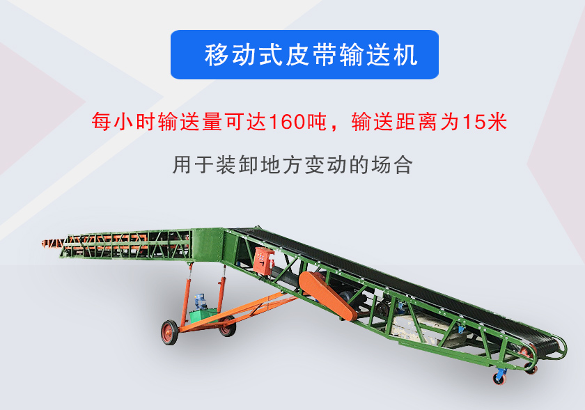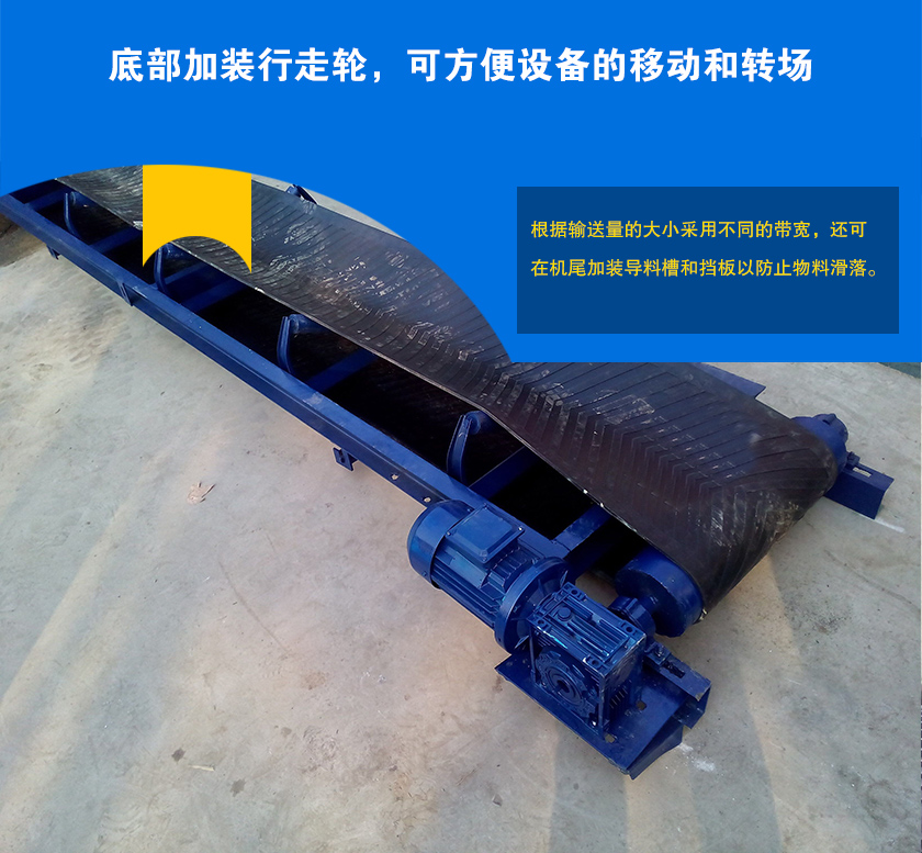 移动式皮带输送机是底部加装了行走轮,移动方便,可根据现场向下输送物料,也可用户倾斜输送,移动式皮带输送机可加装挡料板来防止物料滑落.