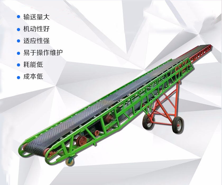 移动式皮带输送机是在普通皮带输送机底部安装移动轮,大、小行走轮采用实心胶轮,防止压碎粮食及仓库地面,可以根据物料的堆放位置随意移动,人工即可推动出入仓库,主要用于装卸地方变动的场合,如:砂石料场、建筑工地、煤场等。移动式皮带输送机有电动和手动升降两种类型,具有快、慢两种速度,以适应散运、包装的不同要求??梢缘ヌɑ蚨嗵ù褂?,也可与其他设备配套使用,具有输送量大、机动性好、适应性强、易于操作维护、耗能低、成本低等特点。