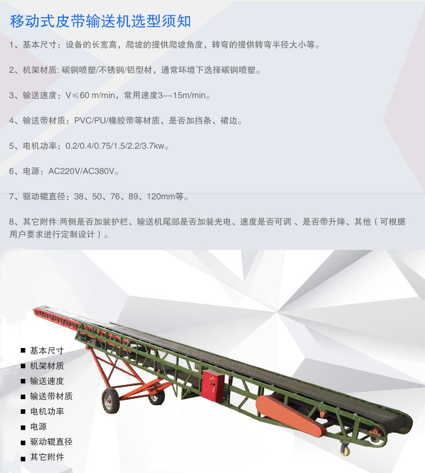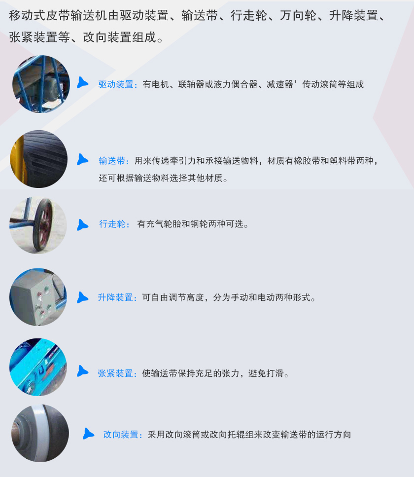 移动式皮带输送机由驱动装置、输送带、行走轮、万向轮、升降装置、张紧装置等、改向装置组成。