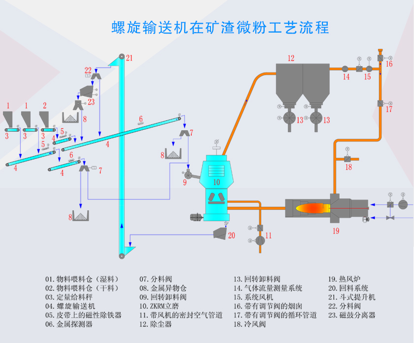 螺旋输送机在矿渣微粉工艺流程中起着重要的作用。以下是一般情况下螺旋输送机在矿渣微粉工艺流程中的应用过程: