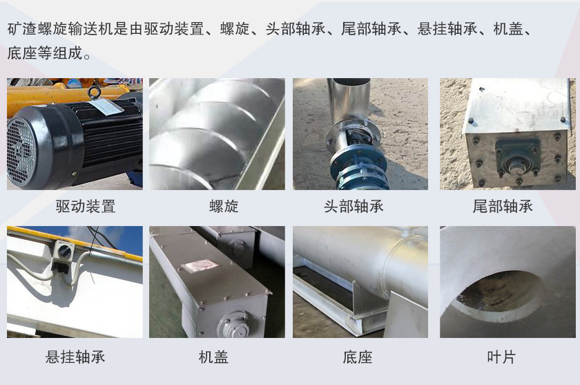矿渣螺旋输送机是由驱动装置、螺旋、头部轴承、尾部轴承、悬挂轴承、机盖、底座等组成。驱动装置:由电动机、减速器、联轴器等组成。螺旋轴与吊轴承、头部轴承、尾部轴承联接采用嵌入舌式,安装拆卸不需轴向移动,维修方便,采用变径结构,增大吊轴承处的容积,避免吊轴承与物料接触,各传动部位采用浮动联接方式,头尾轴承座均在壳体外,所有轴承采用多层密封和配合密封技术,轴承使用寿命长。