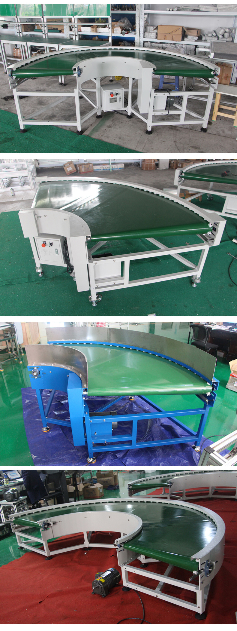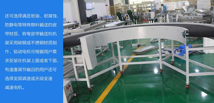 转弯皮带输送机简称转弯皮带机,是输送流水线中使用比较广泛的一种设备,用于输送带与输送带之间弯角的连续或间歇运动来输送各种轻重不同的物料,常见的角度为30°,45°,90°和180°,能够满足各种转弯输送的工艺要求,转弯皮带输送机输送带可根据输送物料的性质选择PVC、PU材质,除输送普通物料外,还可选择满足耐油、耐腐蚀、防静电等特殊物料输送的皮带材质,转弯皮带输送机机架采用碳钢或不锈钢材质制作,驱动电机可根据用户需求安装在机架上面或者下面,有速度调节幽囚的用户还可选择变频调速或无级变速减速电机。
