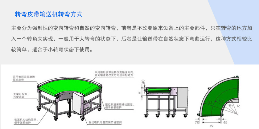 主要分为强制性的变向转弯和自然的变向转弯,前者是不改变原来设备上的主要部件,只在转弯的地方加入一个转角来实现,一般用于大转弯的状态下,后者是让输送带在自然状态下弯曲运行,这种方式相较比较简单,适合于小转弯状态下使用。
