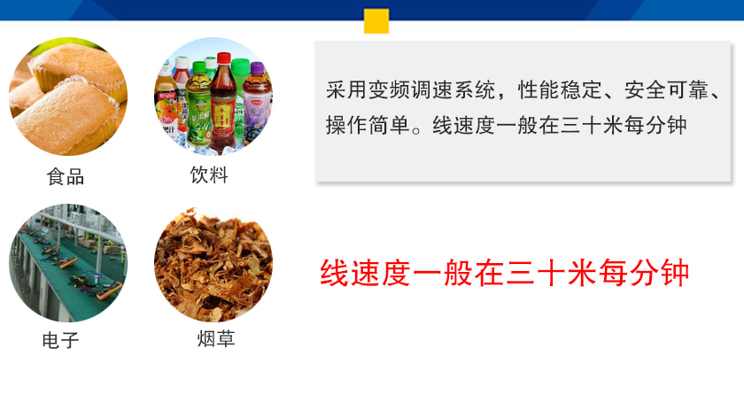 广泛应用在食品、饮料、电子、烟草等行业,我们可以选用较小直径的滚筒,使转角连接更加方便,解决过渡问题。本设备适用于各种流水作业的生产厂家,中小型物品的物流输送,动力系统采用变频调速系统,性能稳定、安全可靠、操作简单。线速度一般在30米/分钟。