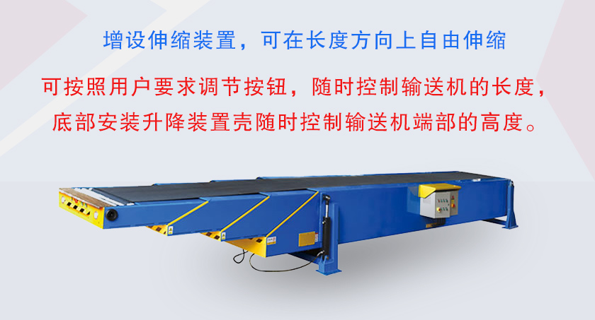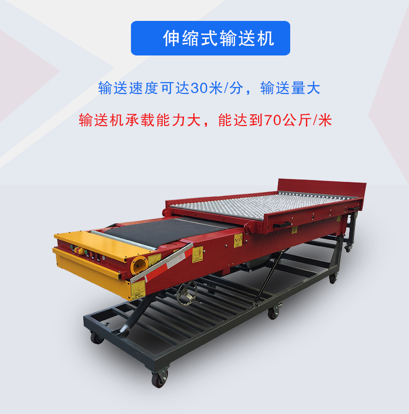 伸缩式输送机即伸缩式皮带,可以根据工作面位置变化调整自身长度的输送机,伸缩式输送机可在长度方向上自由伸缩,自由调控输送长度,减少了装卸货物的时间,降低了工人的劳动强度,可用于输送粉状、粒状物料输送.