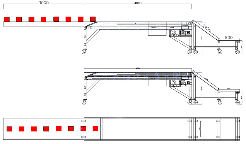 2、可按照用户要求调节按钮,随时控制输送机的长度,底部安装升降装置壳随时控制输送机端部的高度。