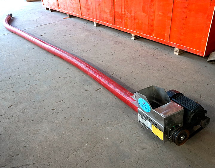软管无轴螺旋输送机是专门针对农村运粮、装车、倒垛、仓储而设计的一种小型设备,具有体积小,重量轻,便于移动,吸粮率高,破损率低,便用场合广泛,安全可靠等特点,非常适合个体农户,粮食专业户及农业合作社使用。亦可以用在养殖场,饲料厂,食品厂,塑料厂等输送颗粒的场合。可输送小麦、大豆、玉米、稻谷、高粱、养料、树脂、大米等颗粒(颗粒直径3-10mm)。可水平、倾斜方式输送。比任何运送方式、运送成本都低。它改变传统运送方式,解放劳动力,方便适用。