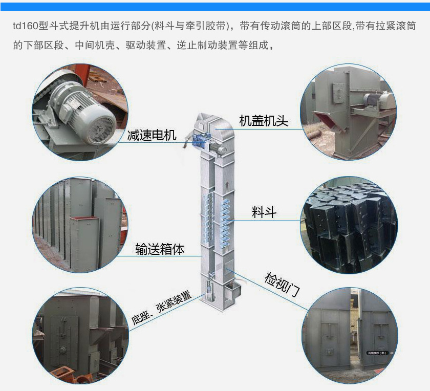 td160型斗式提升机由运行部分(料斗与牵引胶带),带有传动滚筒的上部区段,带有拉紧滚筒的下部区段、中间机壳、驱动装置、逆止制动装置等组成,
