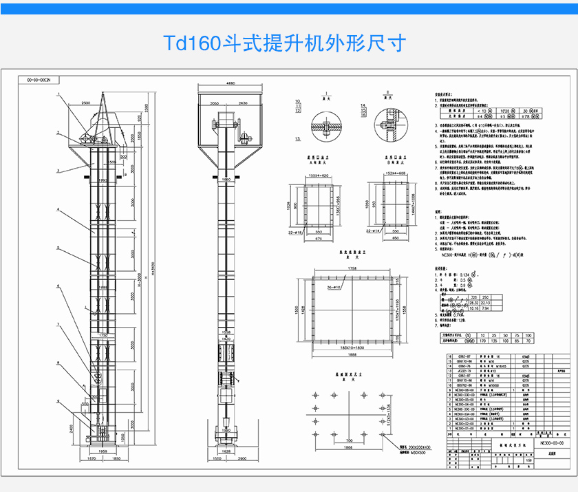 td160斗式提升机斗宽为160mm,斗速为1.4米/秒,是一种小型td斗式提升机,可以垂直输送粉状、颗粒状及小块状的磨琢性散装物料,td160型斗式提升机备有四种料斗Q型(浅斗)、H型(弧底斗)、ZD型(中深斗)SD型(深斗)。