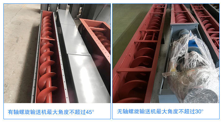 有轴螺旋输送机角度不超过45°,有轴螺旋输送机因机体有轴分布,输送物料相对无轴少。