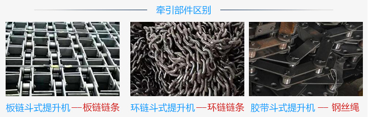 环链斗式提升机牵引件选用优质合金钢高度圆环链;板链斗式提升机的链条是优质合金钢高强度板式链条;胶带斗式提升机采用高强度的钢丝绳作为牵引部件。