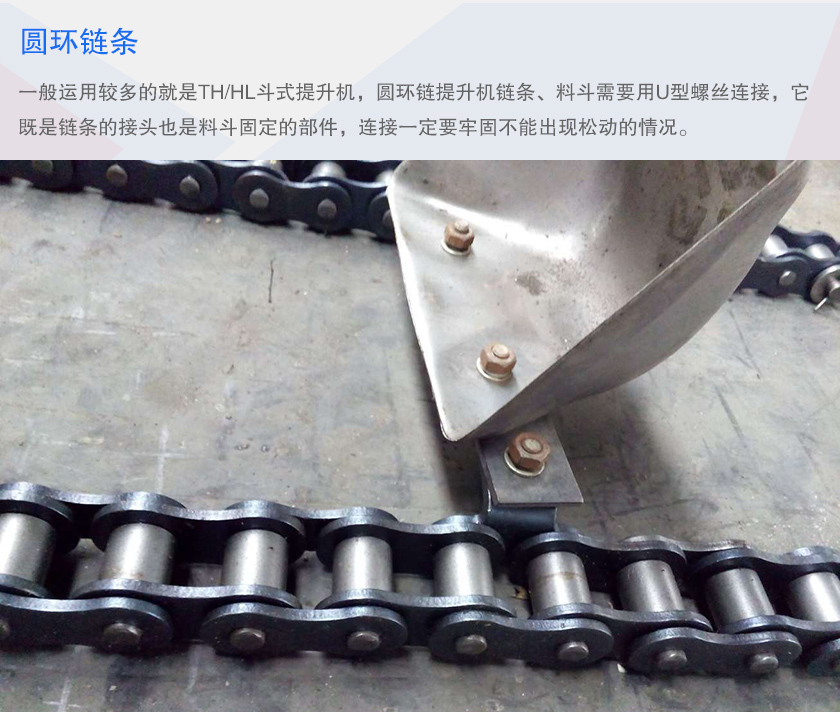 斗式提升机圆环链条一般运用较多的就是TH斗式提升机,圆环链提升机链条、料斗需要用U型螺丝连接,它既是链条的接头也是料斗固定的部件,连接一定要牢固不能出现松动的情况。