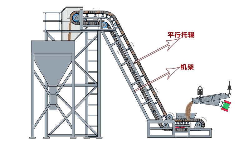 3、上水平段:为卸料端。根据不同高度的排放要求,使用的头架高度不同,中间架的支腿需要根据头架进行匹配。