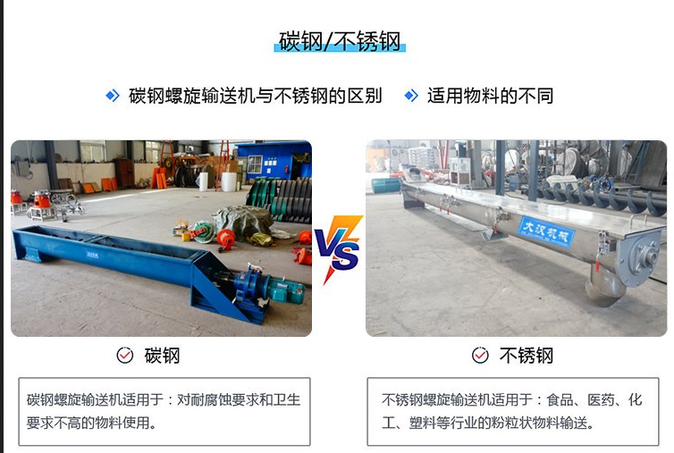 碳钢无轴螺旋输送机:采用Q235碳钢制造,主要用于水泥、煤炭、石料等磨损较大、对材料无特殊要求的行业。