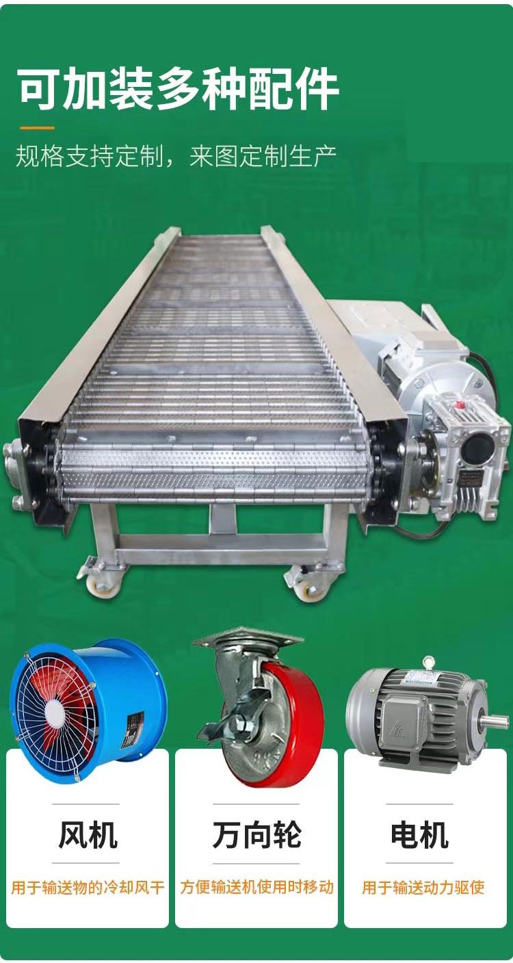 链板输送机由电机、传动轴、链轮、链条、轴承、润滑剂、链板、滚筒、张紧设备、等组成。其中链条和链板主要起到带动产品运动的作用。链条使用循环往复运动提供了牵引动力,金属板是承载体,在链条牵引力的作用下承载物料沿着水平或倾斜方向输送。