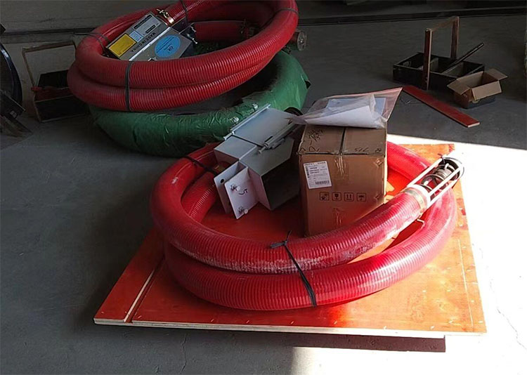 100毫米柔性螺旋输送机工作时,机器的进料口插入待输送物料的堆放处,通过电机驱动使柔性管道内的弹簧叶片旋转产生向前的推力,使物料沿着密封管道向前移动直至出料口位置排出。