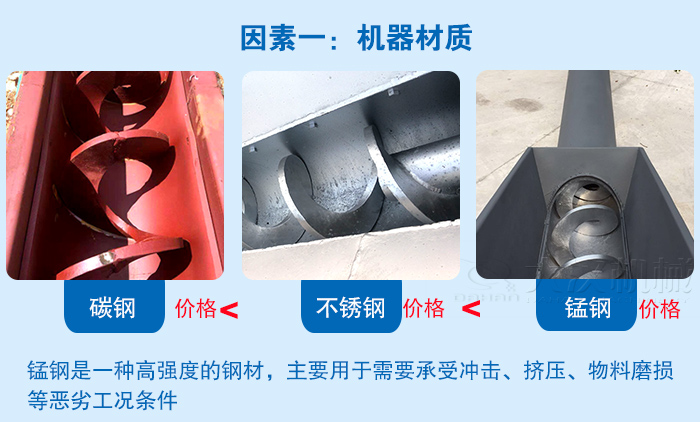 无轴螺旋输送机的材质主要有:碳钢、不锈钢、锰钢等三种,其价格高低为:碳钢<不锈钢<锰钢,其中锰钢是一种高强度的钢材,主要用于需要承受冲击、挤压、物料磨损等恶劣工况条件,所以价格相比其他材质会好一些。