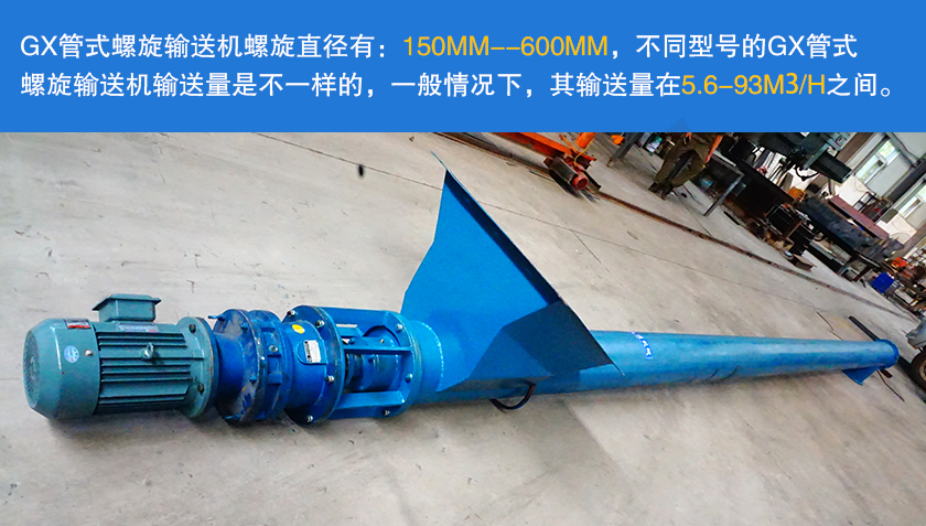 GX管式螺旋输送机螺旋直径有:150mm,200mm,250mm,300mm,400mm,500mm,600mm,不同型号的GX管式螺旋输送机输送量是不一样的,一般情况下,其输送量在5.6-93m³/h之间。