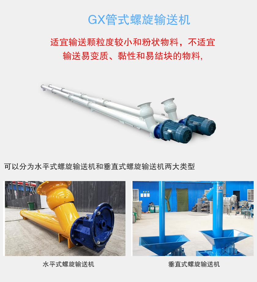 GX型管式螺旋输送机是按照JB/T679-95《螺旋输送机》标准设计制造,是LS型螺旋输送机的换代产品,适宜输送颗粒度较小和粉状物料,不适宜输送易变质、黏性和易结块的物料,可以分为水平式螺旋输送机和垂直式螺旋输送机两大类型。