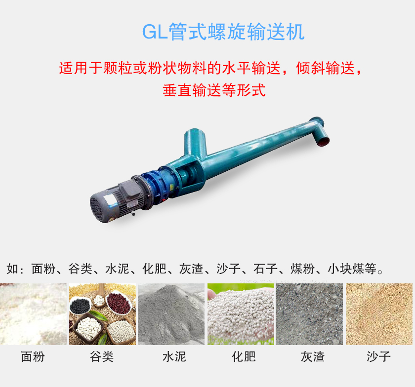 GL管式螺旋输送机适用于颗?;蚍圩次锪系乃绞渌?,倾斜输送,垂直输送等形式,如:面粉、谷类、水泥、化肥、灰渣、沙子、石子、煤粉、小块煤等。