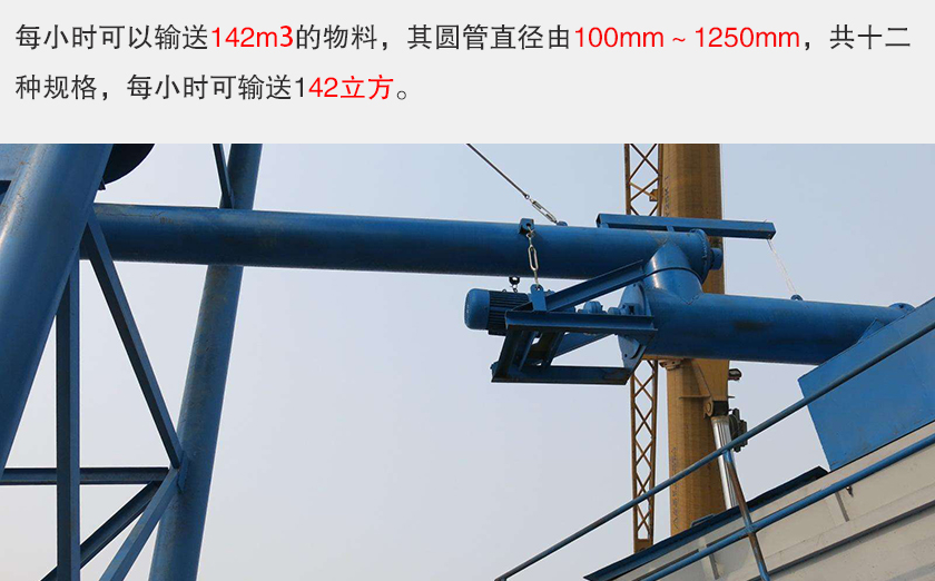 管式螺旋输送机每小时可以输送142m³的物料,其圆管直径由100mm~1250mm,共十二种规格,每小时可输送142立方。