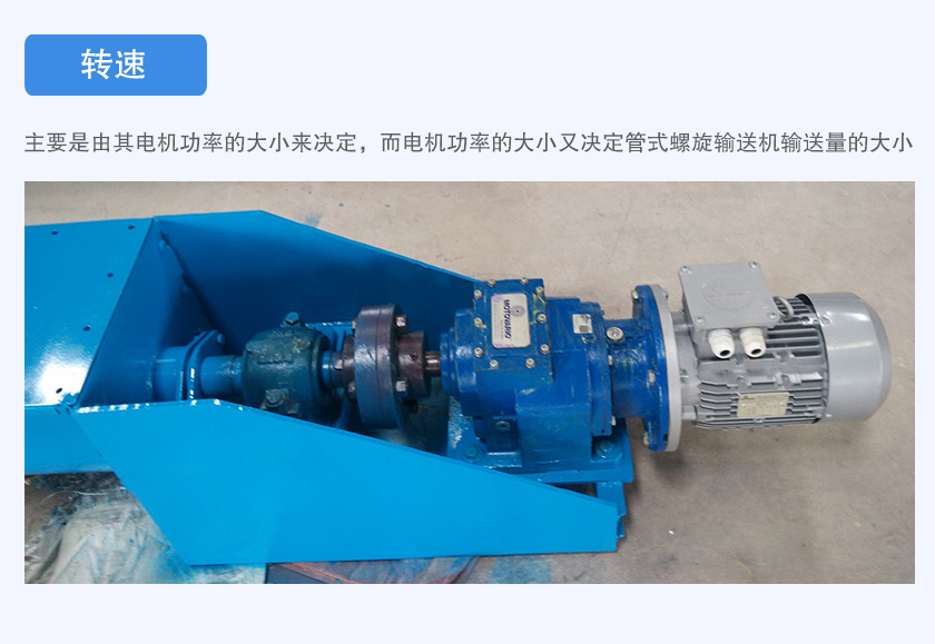 管式螺旋输送机转速主要是由其电机功率的大小来决定,而电机功率的大小又决定管式螺旋输送机输送量的大小,如果电机功率过小,会导致物料在管内的运行速度变慢,减低输送效率,严重情况下还会导致电机烧毁。如果电机功率过大,会耗电量上升,增加企业运行成本。